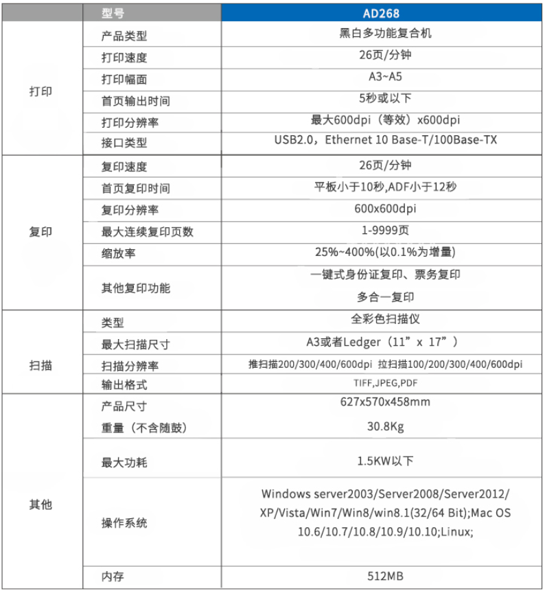 震旦打印機AD268黑白多功...