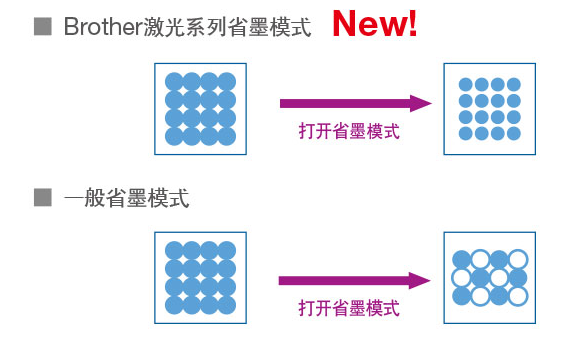 Brother支持省墨模式,通過縮小墨點的大小來達到省墨的效果,而不是通過減少墨點,這樣即使使用省墨模式,也能保證打印效果。