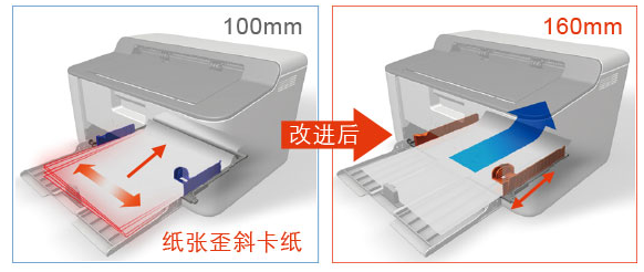 導(dǎo)塊從100mm增長至160mm,確保紙張從走紙直至打印引擎都能平整,減少紙張歪斜的煩惱。