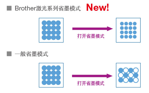 Brother省墨模式是通過縮小墨點空間大小來完成,墨點數(shù)量保持不變,所以即使打開省墨模式也不會影響打印清晰度。